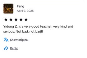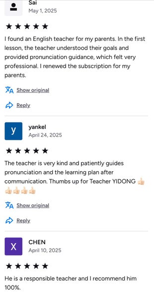 "You are a very meticulous and dedicated teacher. You not only pay attention to my motivation and contexts for using English but also carefully understand my psychological state during the learning process, patiently helping me make adjustments. Thank you so much for your support—you are an excellent teacher 👍"